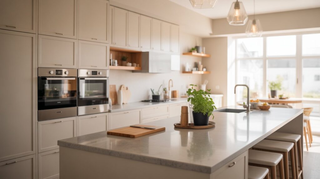 Focus on practical storage solutions to keep utensils, appliances, and everyday items neatly tucked away. This not only makes the kitchen easy to maintain but also enhances its overall style, turning it into a comfortable, efficient, and visually appealing area for cooking and spending time with family.