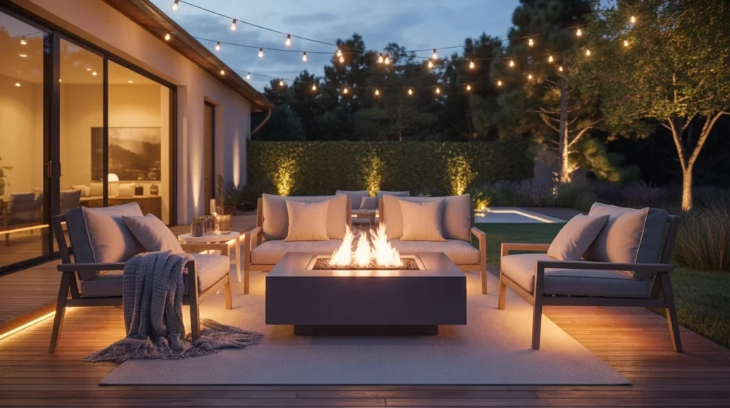 A fire feature makes any deck feel more inviting and memorable. Whether you choose a propane fire table or a compact fire pit, this setup adds warmth, light, and a natural gathering point. It turns your deck into a place people want to stay longer, especially in cooler months or in the evening. This trending aesthetic fits modern, rustic, and cozy outdoor styles, and it pairs beautifully with lounge chairs and layered textiles.