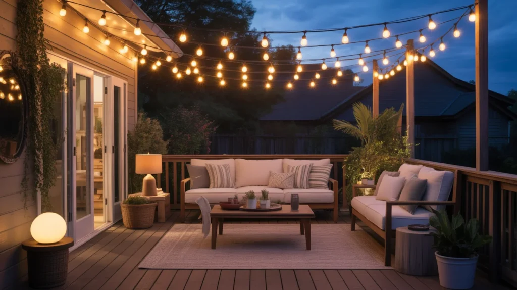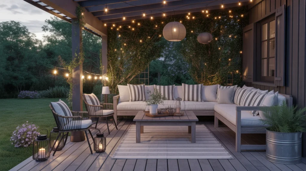 String lights are a favorite for a reason. They make a deck feel warm, inviting, and magical without requiring a large budget. Draped overhead, wrapped around railings, or styled along a pergola, they create a soft glow that works beautifully for both everyday evenings and special gatherings. This decor inspiration is simple, timeless, and perfect for anyone looking for a cozy, trending aesthetic. Lighting is often what makes outdoor room ideas feel complete, especially after sunset.