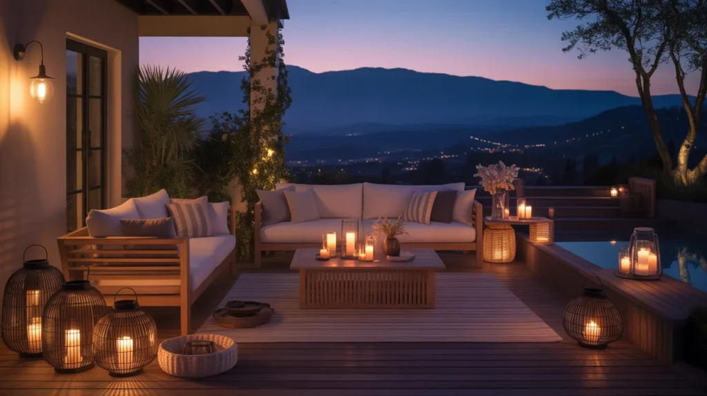 Lanterns add charm during the day and ambiance at night. Grouped on the floor, table, or steps, they create visual warmth and make the deck feel thoughtfully styled. Battery candles are easy and safe, while solar lanterns add convenience. This is one of the simplest outdoor living space ideas, but it has a big impact on the atmosphere. It works with nearly every decor style and pairs beautifully with string lights, greenery, and cozy seating.