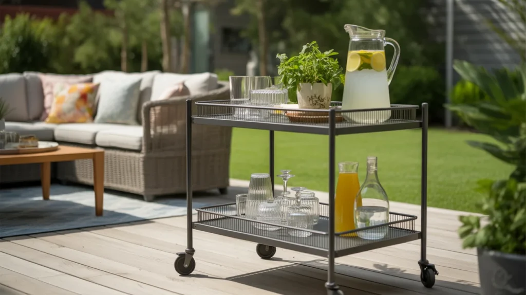 A bar cart or drink station makes entertaining easier and adds a stylish focal point. It can hold glassware, pitchers, napkins, herbs, and decorative accessories while making the deck feel thoughtfully arranged. This is one of those stylish ideas that feels both fun and useful. Even if you do not entertain often, a simple beverage corner adds charm and gives the space a lifestyle feel that works especially well for Pinterest.