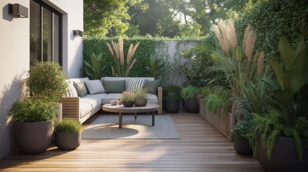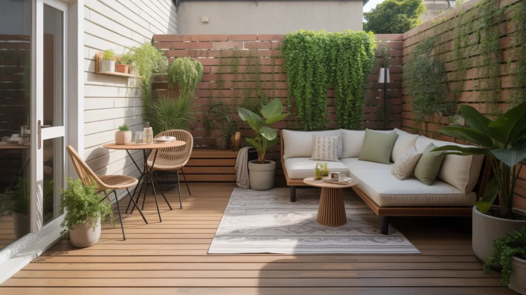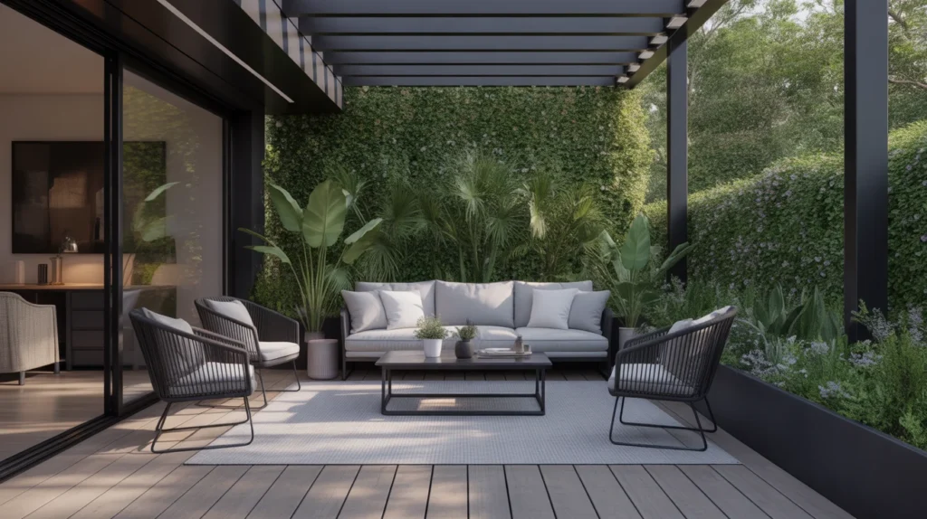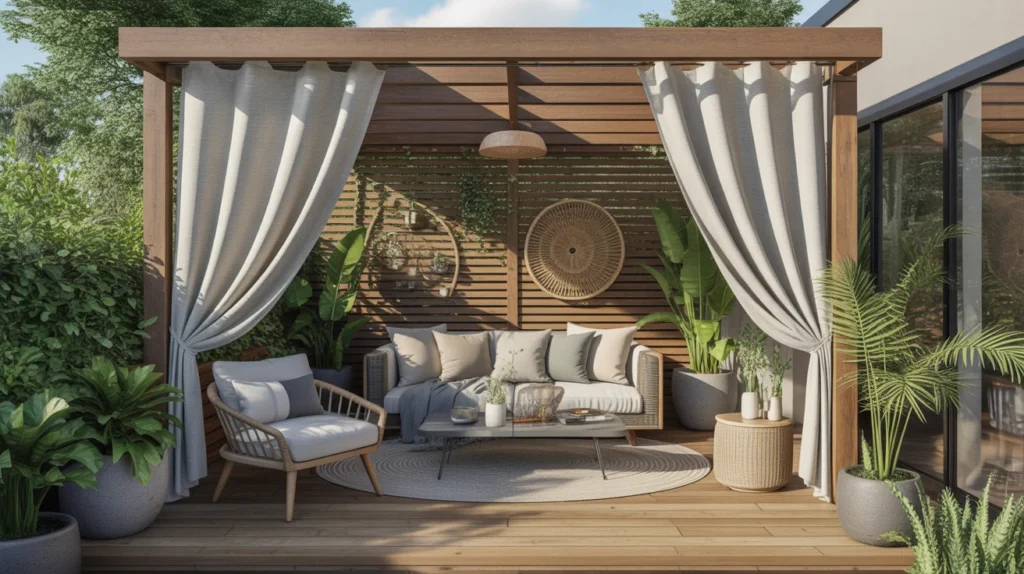 Privacy can make a deck feel more comfortable and intimate. Decorative screens, slatted wood panels, trellises, or outdoor curtains help block unwanted views while adding style. This idea is especially useful for urban homes, townhouses, or closely spaced neighbors. It also creates a resort-like look that feels intentional and elevated. If you want stylish ideas that blend beauty and comfort, a private corner is one of the most effective ways to create an outdoor living space.