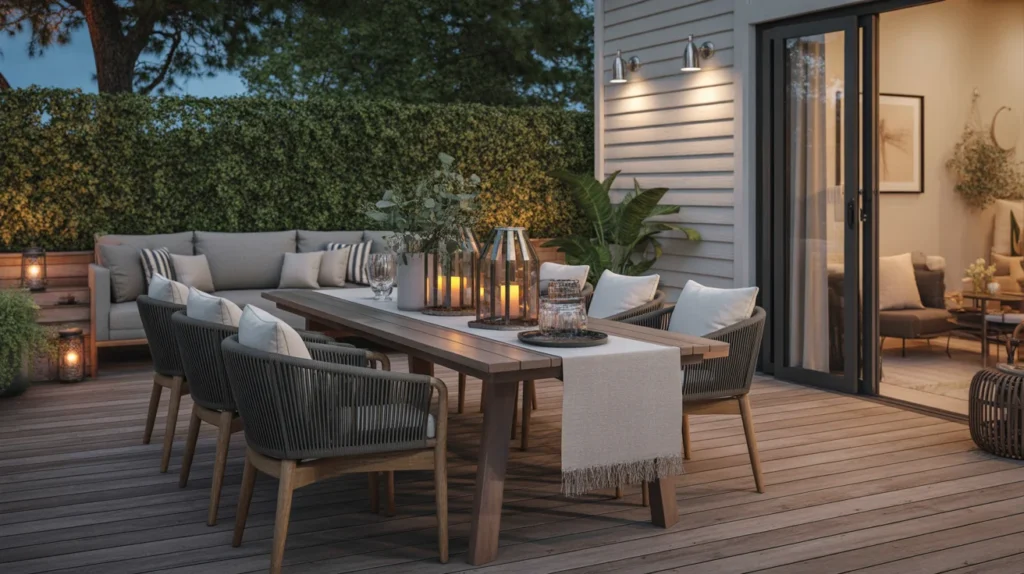A dining area makes your deck feel intentional and ready for entertaining. Even a compact bistro table can turn an unused corner into a charming place for breakfast or dinner outdoors. For larger decks, a full dining table with matching chairs creates a welcoming spot for family meals and gatherings. This is one of the most practical outdoor layout ideas because it blends beauty with function. To keep the look Pinterest-friendly, style the table with a runner, lanterns, and simple outdoor dinnerware for a polished but relaxed feel.