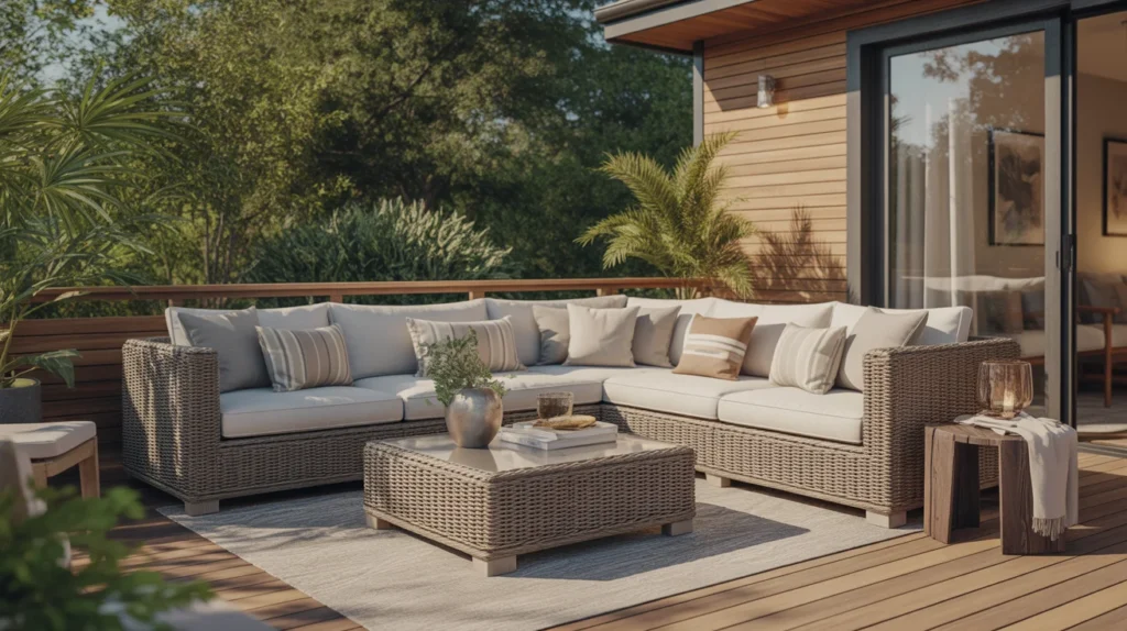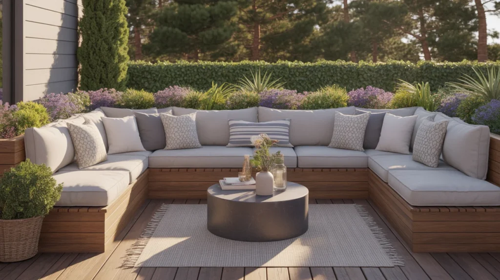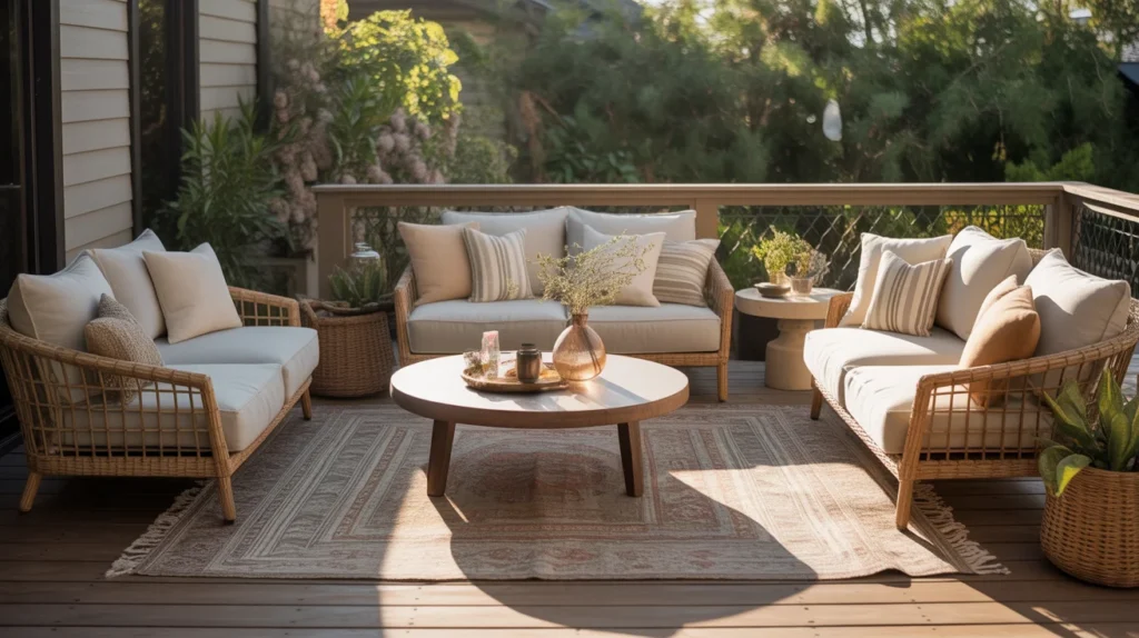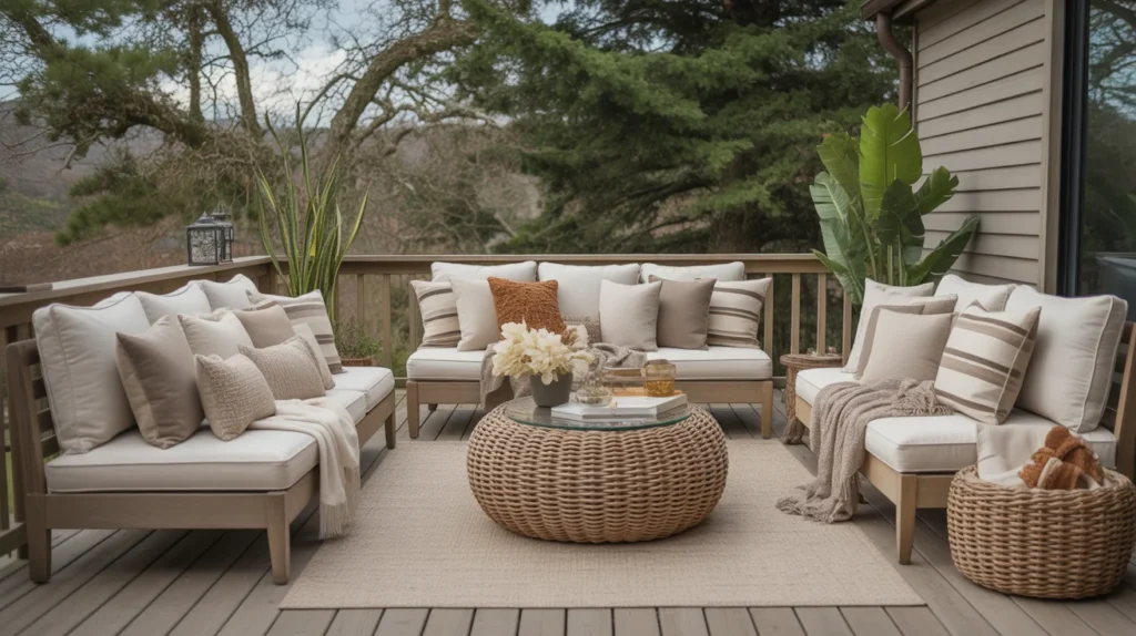 One of the most popular back deck decorating ideas is turning part of the deck into a lounge area. Think weather-resistant sofas, deep seat cushions, and a coffee table that makes the space feel like an outdoor living room. This setup works especially well for relaxing after work or hosting friends in a casual, inviting way. For a Pinterest-ready trending aesthetic, layer soft textures with neutral furniture and a few accent colors. This type of decor inspiration feels elevated without being overly formal, instantly making the deck more usable every day.