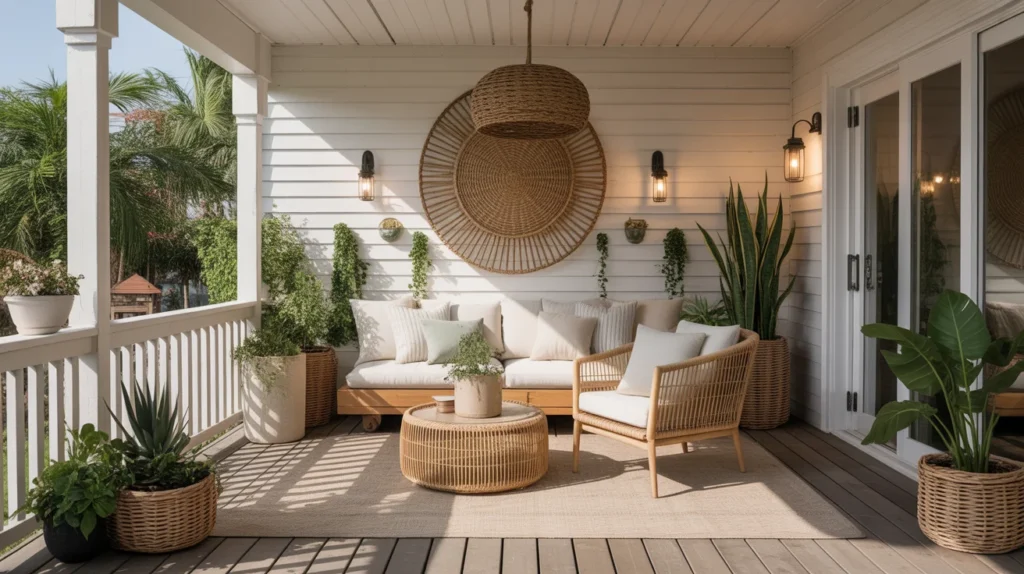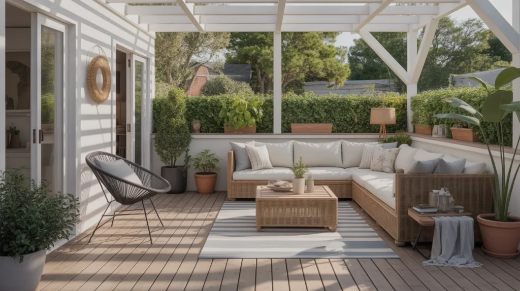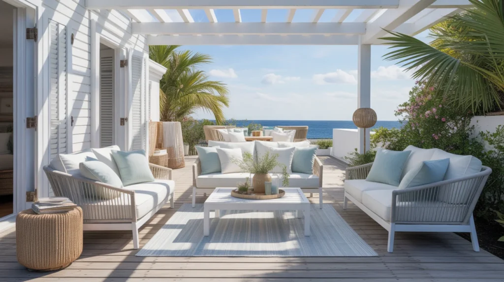 If you love light, airy spaces, a coastal deck is a beautiful direction. White, beige, pale blue, and weathered wood tones create a calm and breezy atmosphere that feels fresh and timeless. This style works especially well with striped cushions, rope details, and simple accessories. It is one of the most universally appealing room ideas because it feels clean, relaxing, and easy to maintain. For a Pinterest-ready finish, keep the look uncluttered and bright.