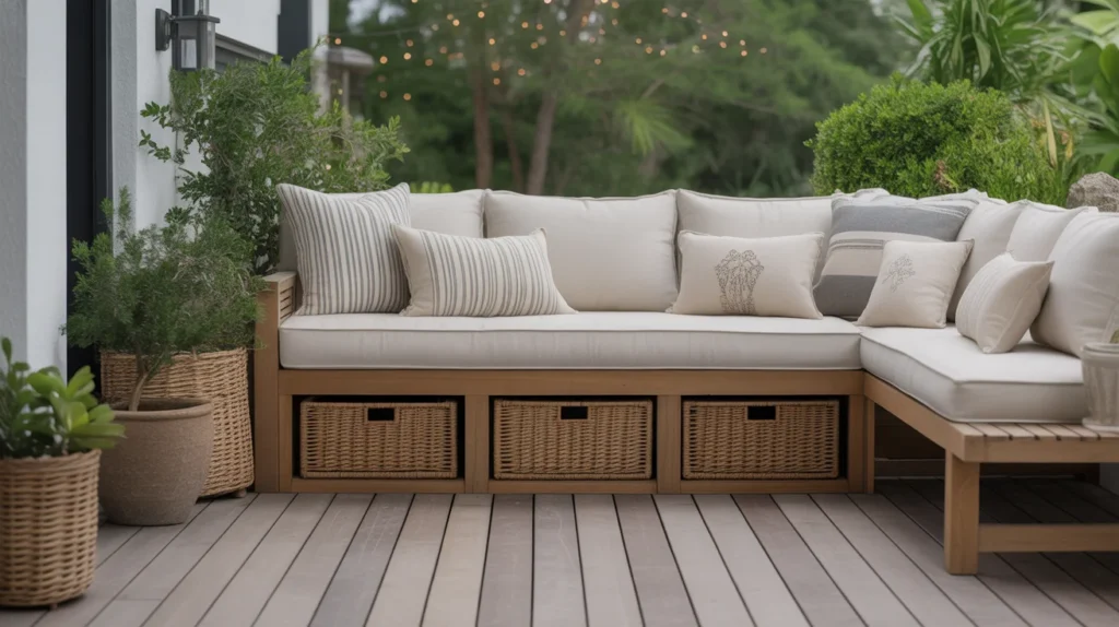 Storage can be decorative when chosen well. Deck boxes, benches with hidden compartments, shelving, and woven baskets help keep pillows, gardening tools, or entertaining items organized. A clutter-free deck always looks more polished and more relaxing. This is one of the most important back deck decorating ideas because even beautiful spaces can lose their charm when they feel crowded. Look for storage pieces that match your deck style so they feel intentional instead of purely functional.