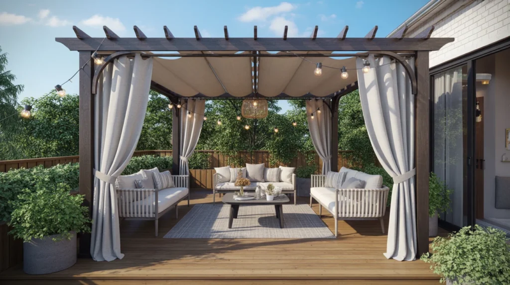 Shade makes a deck more comfortable and more visually defined. A pergola, umbrella, sail shade, or canopy adds structure while helping the space feel cooler and more intentional. It also gives you a place to hang lights, plants, or curtains for extra style. Among all patio styling ideas, this one can completely change how often you use the space. A shaded deck feels more like an outdoor room and photographs beautifully for a stylish Pinterest look.