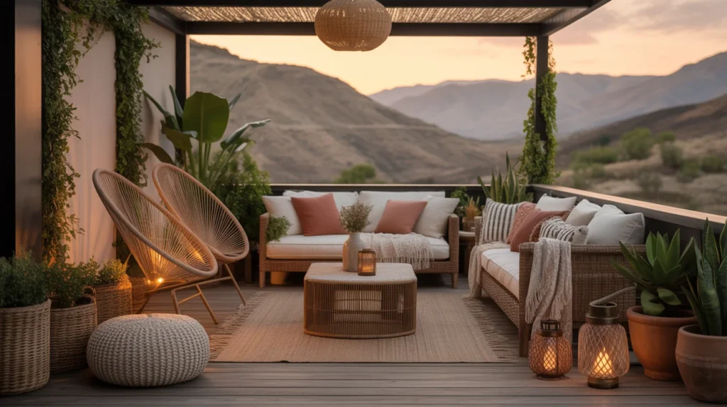 A boho deck feels layered, relaxed, and welcoming. Think woven chairs, patterned textiles, lanterns, poufs, and lots of natural texture. This look is full of decor inspiration and works beautifully for anyone who wants a softer, more collected feel. The key is mixing materials without making the space feel messy. A boho deck can still feel elevated when you stick to a controlled color palette and repeat similar textures throughout.