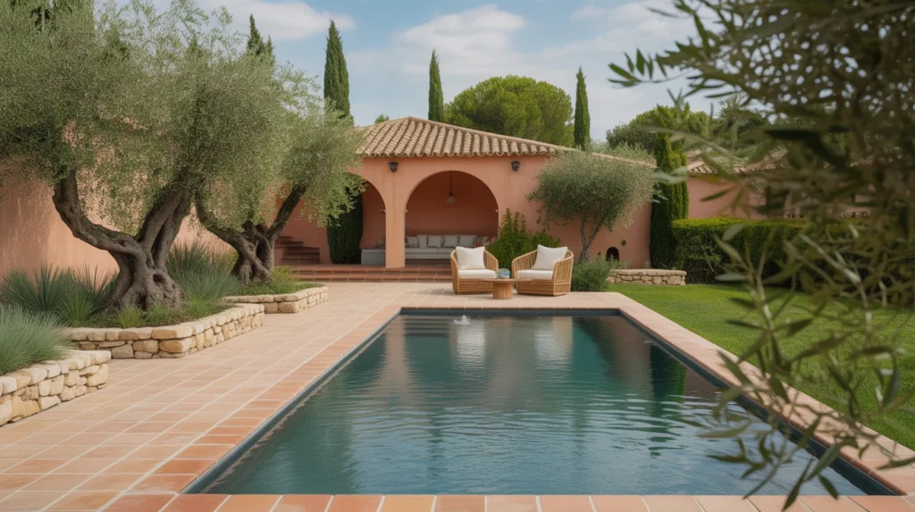 Mediterranean pool landscaping brings a touch of European elegance to your backyard. Using warm stone materials, terracotta tiles, and olive trees, you can create a sunny, inviting atmosphere that feels like a luxurious retreat. The earthy tones of terracotta and stone blend beautifully with the green foliage of olive trees, enhancing the natural beauty of the pool area. Add a stone patio and lush plants to complete the look, creating a relaxed, yet sophisticated vibe. This design style offers a timeless, warm feel perfect for enjoying leisurely days by the pool.