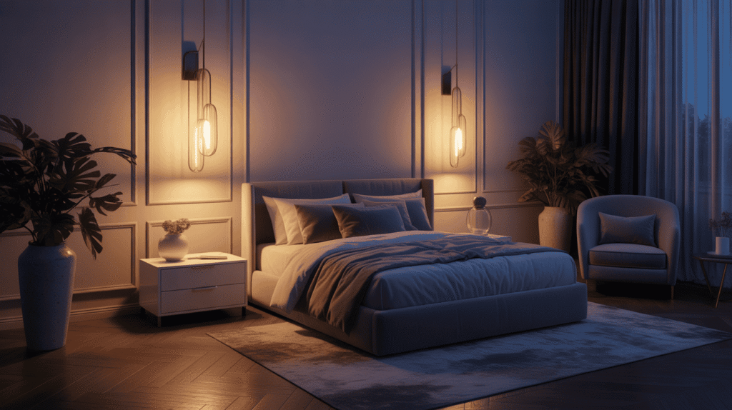Soft lighting plays a key role in creating a calm and elegant bedroom atmosphere. Warm bedside lamps, wall sconces, and subtle ambient lighting help reduce harsh shadows and bring a cozy, relaxing feel to the space. This type of lighting is perfect for winding down at night, adding both comfort and sophistication. Choosing warm-toned bulbs and well-placed light sources enhances the bedroom’s elegance while maintaining a peaceful, intimate mood.