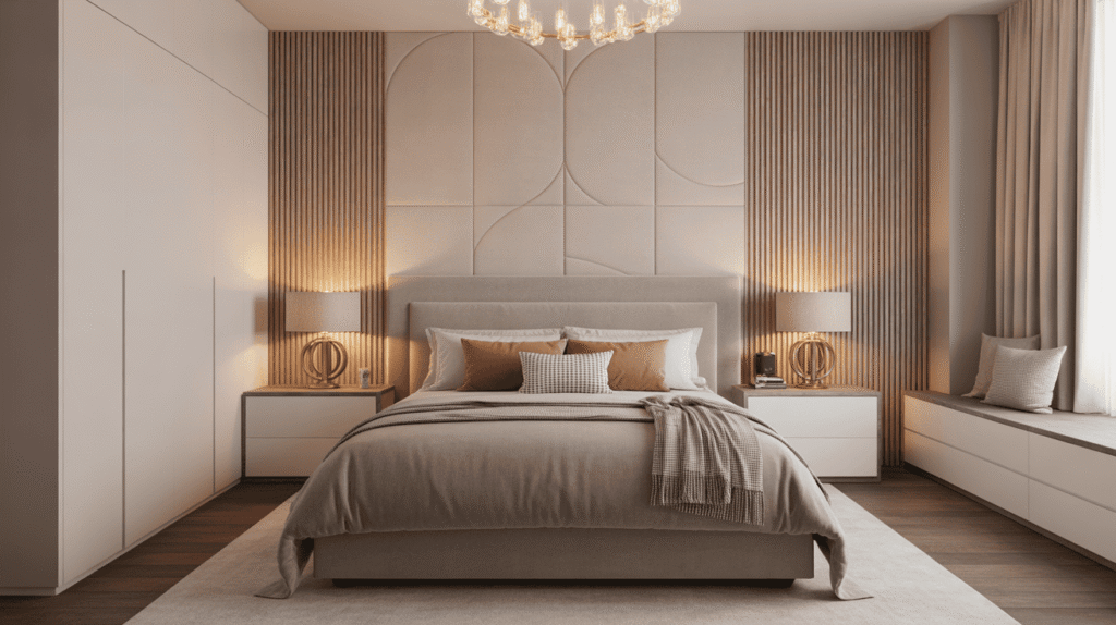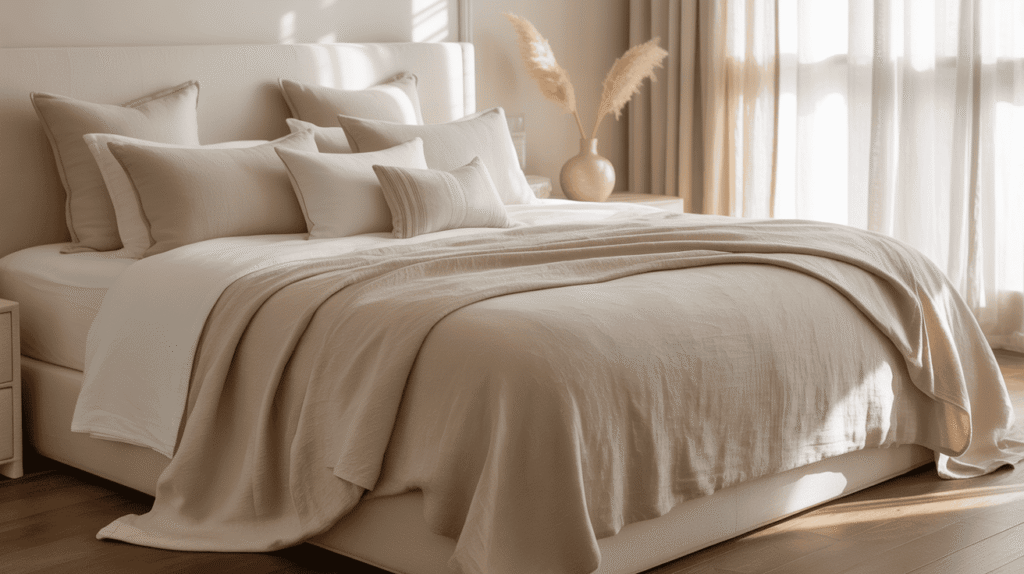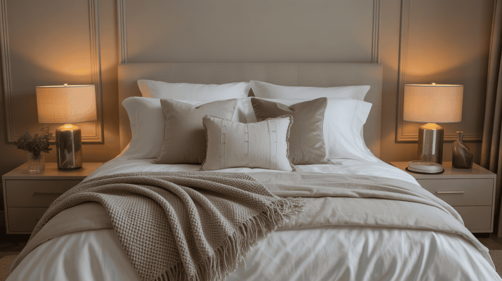 Layering different textures such as smooth cotton, soft linen, or subtle knits adds depth without overwhelming the design. When kept in neutral or muted tones, luxury bedding enhances the overall calm and timeless look of the bedroom, turning it into a cozy yet sophisticated retreat.