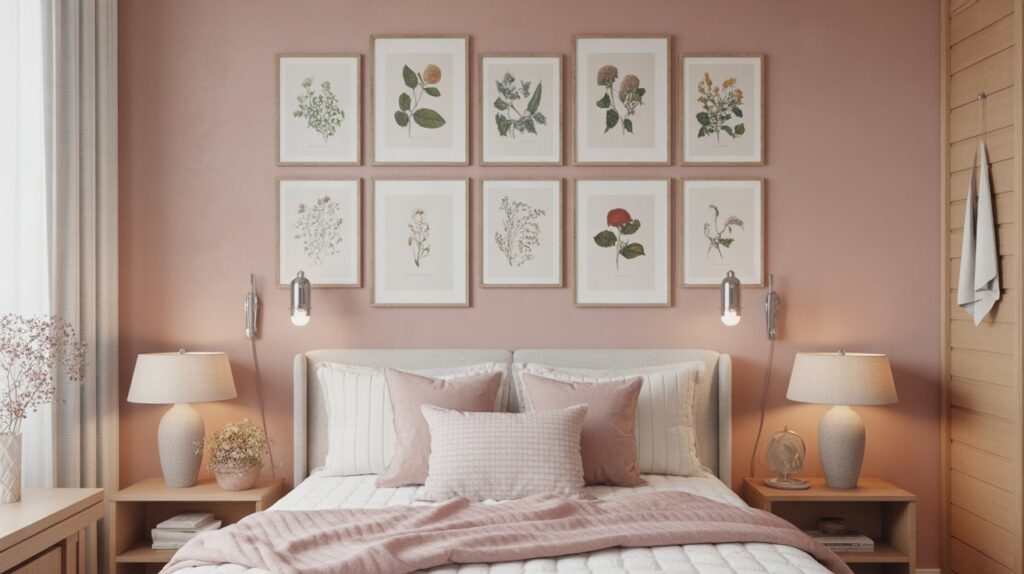 A cottagecore gallery wall brings an artistic, nature-inspired touch to your bedroom. Curate a collection of botanical prints, vintage artwork, pressed flowers, and nature sketches to create a soft, cohesive display. These pieces not only add charm but also connect the space to the natural world. Against soft pastel walls, the artwork enhances the romantic, cozy vibe of the room, creating a peaceful and inviting atmosphere. This gallery wall becomes a focal point, offering a personal, artistic reflection of the serene countryside aesthetic that defines cottagecore living.