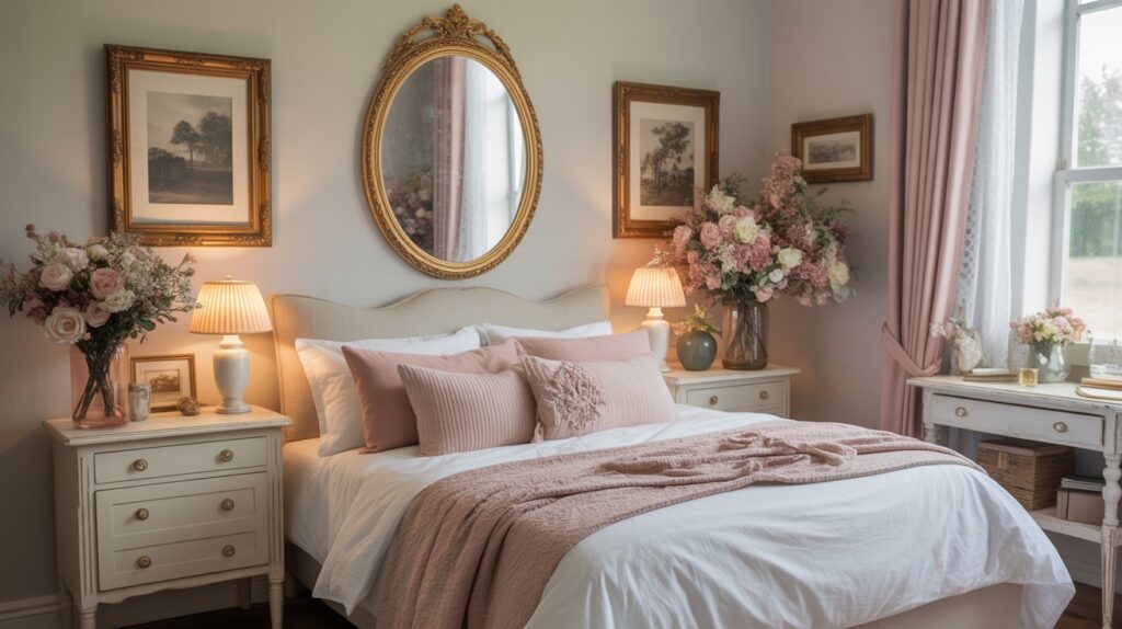 Vintage mirrors and wall frames are perfect for adding character and depth to a cottagecore bedroom. Ornate antique gold mirrors and mismatched vintage picture frames bring a sense of history and charm to blank walls. These pieces not only enhance the room’s aesthetic but also reflect light, helping to brighten the space and make it feel more open. Pairing these with soft floral décor and rustic styling creates a cozy, lived-in atmosphere, blending vintage elegance with the warmth and nostalgia that define the cottagecore aesthetic.