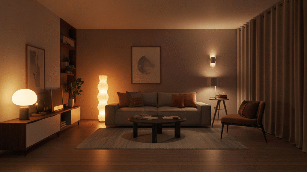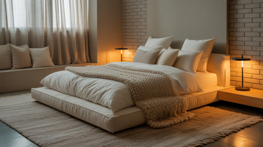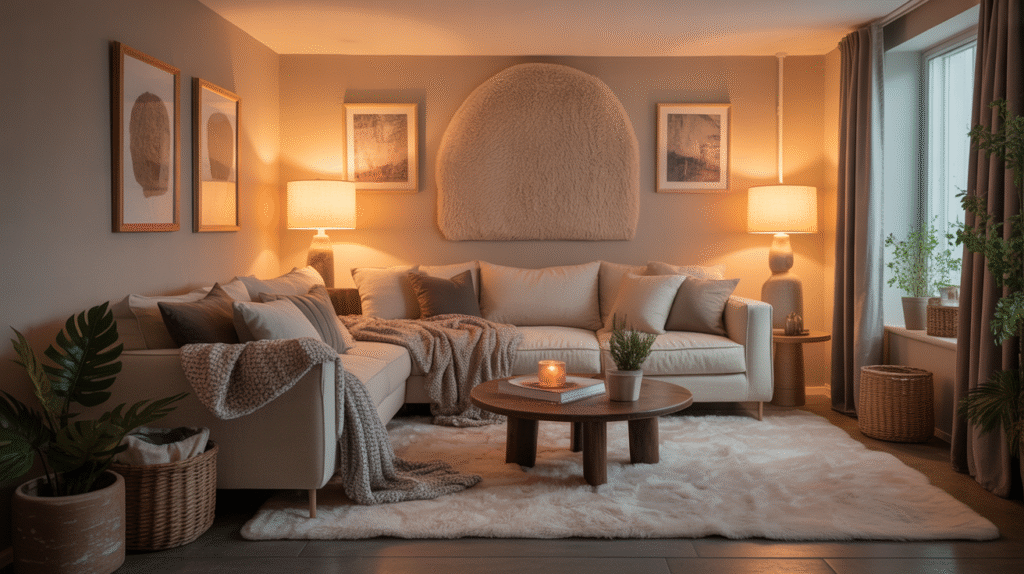 Using area rugs, throw blankets, cushions, and curtains adds both warmth and visual interest. Textured materials such as knit fabrics, soft carpets, and upholstered furniture help balance the space and make it feel more relaxing. Warm lighting enhances these textures and adds to the cozy atmosphere.