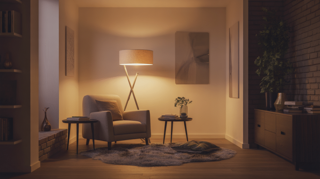 A comfortable armchair or small sofa paired with a floor or table lamp creates a relaxing setup. Adding a side table for books, a soft rug, and a throw blanket increases comfort and makes the space feel complete. Neutral or warm colors help maintain a peaceful atmosphere.