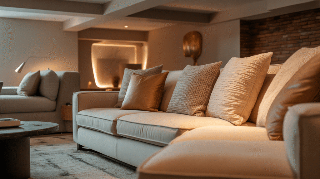 This design idea works well in any basement, whether large or small. By focusing on soft textures, you can transform a simple basement into a cozy space perfect for relaxation.