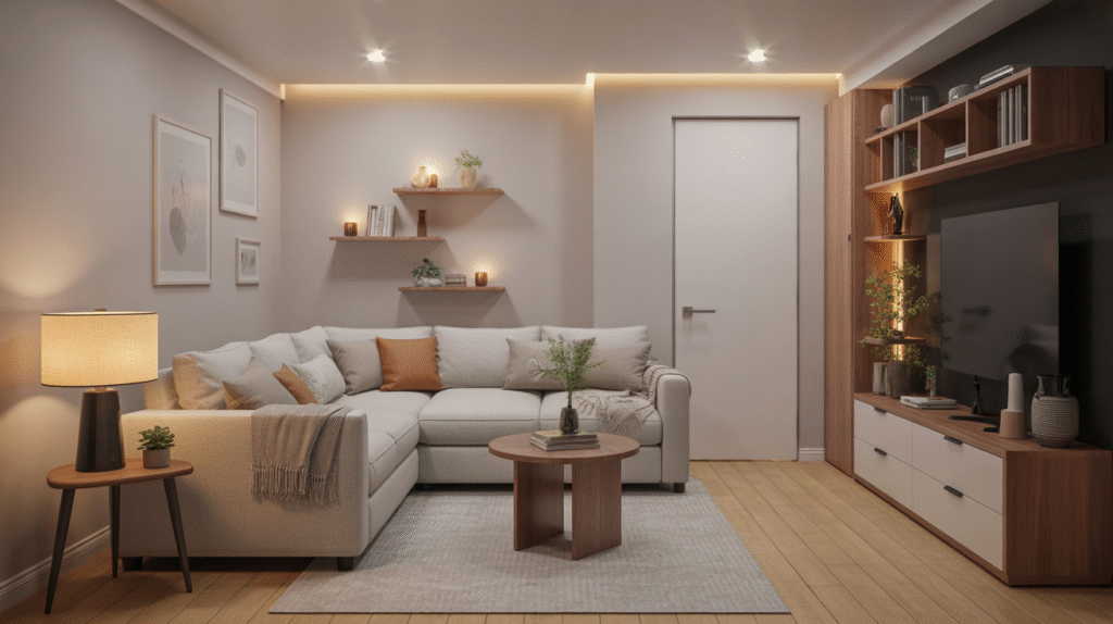 Start with comfortable seating such as a sofa or sectional paired with soft cushions. Adding an area rug helps define the space and brings warmth to the floor. Warm lighting, neutral colors, and simple decor make the room feel balanced and welcoming without overwhelming the space.