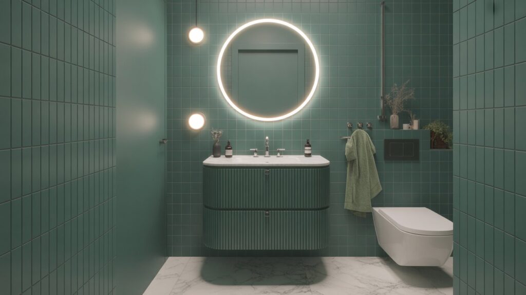 Deep green can work beautifully in small bathrooms when paired with smart lighting and minimal décor. By using deep green on the walls or as an accent, the color adds richness and depth without overwhelming the space. Light-colored elements, such as a marble floor, keep the room feeling open and airy, while soft lighting creates a cozy and inviting atmosphere. A compact vanity and modern mirror help maximize space while maintaining a stylish design. This combination proves that even in smaller bathrooms, deep green can be incorporated effectively to create a chic, serene, and space-efficient environment.