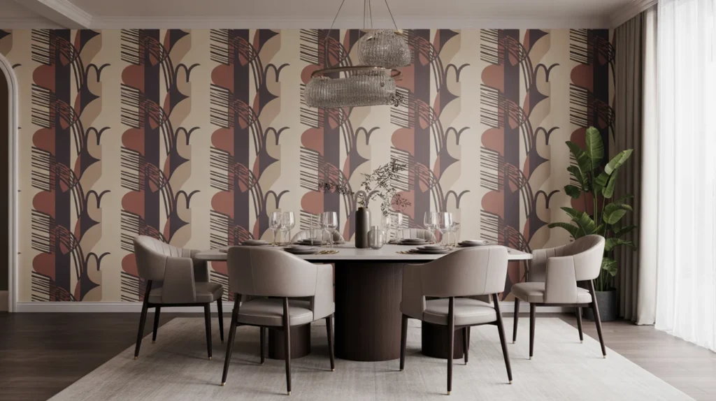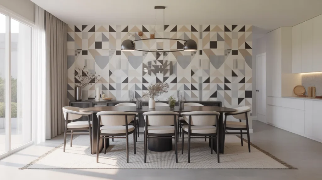 If you’re looking to inject energy and a contemporary vibe into your dining room, bold geometric wallpaper is the perfect choice. With clean lines and striking patterns, geometric designs bring a modern flair to any space. These eye-catching wallpapers create a strong visual statement while maintaining a sleek and stylish aesthetic. The contrast between neutral tones and bold shapes can add depth and intrigue, making the dining area feel dynamic and fresh. Whether you’re hosting a dinner party or enjoying a casual meal, geometric wallpaper sets a sophisticated tone that enhances the modern appeal of your dining room.