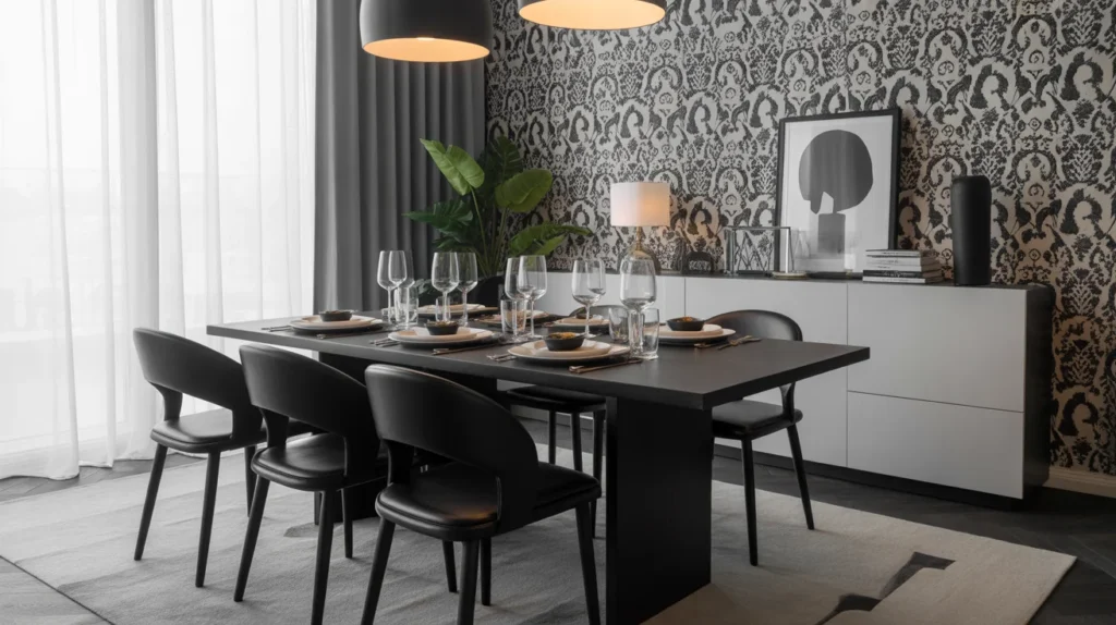 Black and white wallpaper is a perfect choice for those seeking a bold, clean contrast in their dining room. The high-contrast design creates a striking visual impact, making a strong statement while maintaining a sense of sophistication. Whether you opt for geometric patterns, abstract designs, or classic stripes, black and white wallpaper brings an element of modernity and elegance to any space. This timeless design pairs well with various dining room styles, from contemporary to minimalistic, and adds depth and structure to the room without overwhelming it.