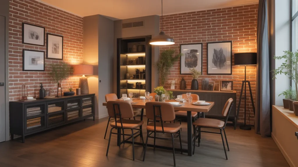 Brick-style wallpaper is an excellent choice for achieving a loft-style, industrial dining space. The textured design mimics the raw, urban charm of exposed brick walls, adding a sense of depth and character to your dining room. This wallpaper brings an edgy yet cozy vibe, perfect for modern homes with a contemporary or rustic aesthetic. Whether you go for a classic red brick or a weathered whitewash effect, it creates a stylish, casual atmosphere that feels both chic and inviting, making it a great backdrop for social gatherings and family meals.
