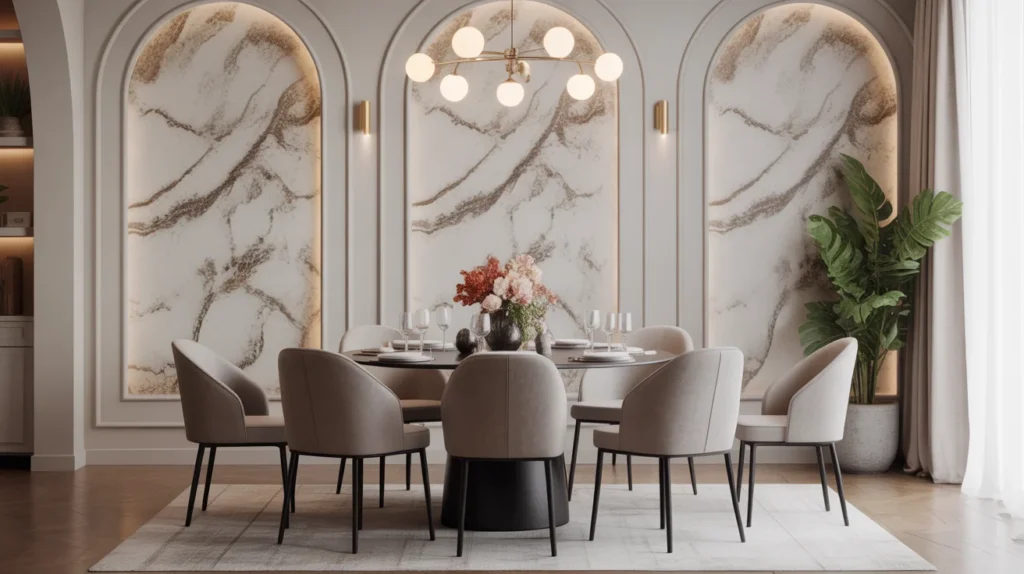 For a luxurious dining room aesthetic without the hefty price tag, marble-effect wallpaper is the perfect solution. This affordable option mimics the stunning elegance of real marble, offering the same sophisticated appearance with none of the maintenance. The intricate veining and polished texture of the wallpaper create a high-end look that exudes refinement and opulence. Whether you’re aiming for a sleek, modern feel or a more traditional, classical vibe, marble-effect wallpaper adds a touch of glamour and timeless style to your dining room.