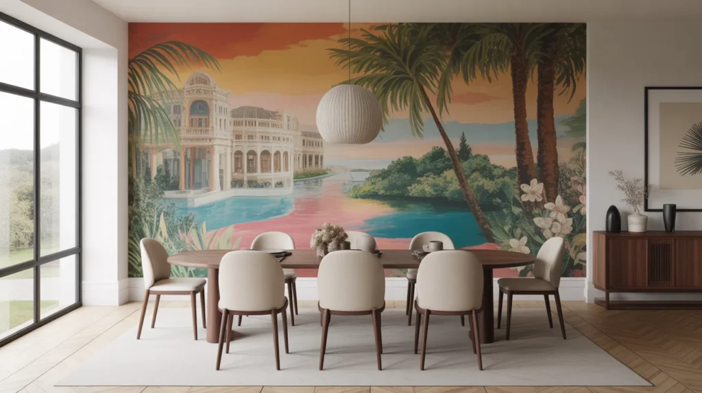 Custom or mural wallpaper is an excellent way to create a unique and personalized dining space that reflects your style and personality. Whether you opt for a custom design, a favorite landscape, or a mural featuring your own artwork, this type of wallpaper turns your dining room into a one-of-a-kind environment. Custom murals can be tailored to fit your space perfectly, adding depth, color, and storytelling elements. This feature not only enhances the room but also serves as a conversation starter, making each meal a memorable experience in a setting that’s truly yours.