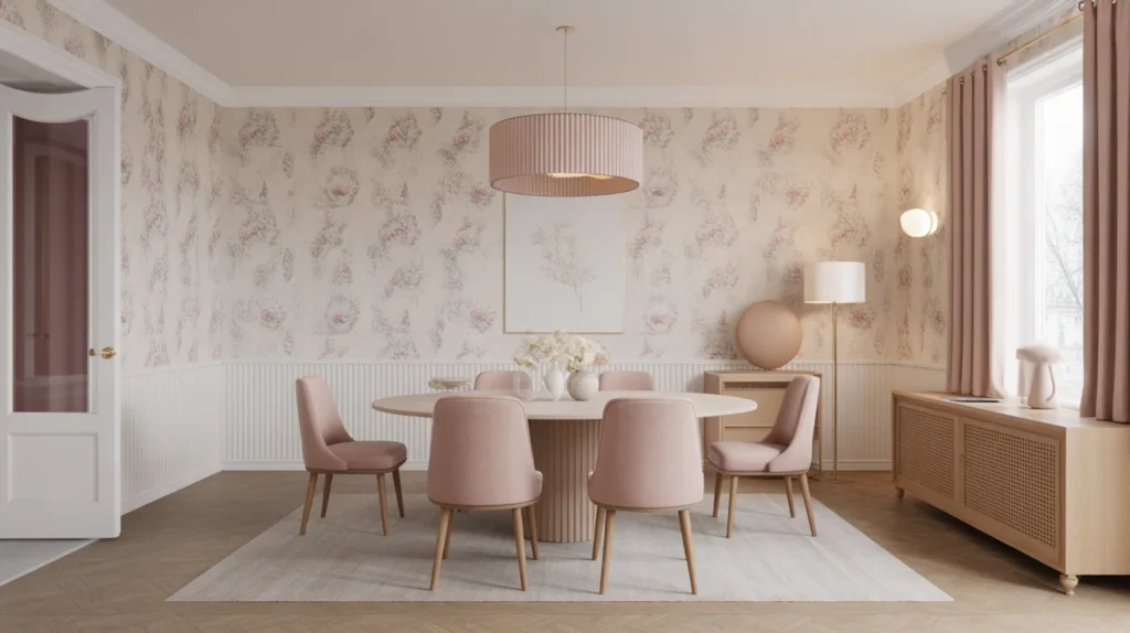 Soft pastel wallpaper is perfect for creating a light, airy atmosphere in your dining room. The gentle hues of blush pink, lavender, or mint green brighten the space without overwhelming it, offering a calm and inviting environment. These subtle tones help to reflect natural light, making the room feel more spacious and serene. Whether you’re aiming for a soft, feminine touch or a serene, neutral backdrop, pastel wallpaper brings warmth and freshness, perfect for a welcoming dining space that exudes relaxation and charm.