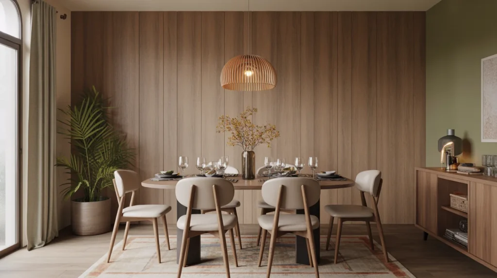 Wood texture wallpaper is a smart way to bring natural warmth into your dining room without the cost or maintenance of real wood panels. It adds a cozy, grounded feeling that makes the space feel more welcoming and comfortable for everyday meals or special gatherings. Whether you choose light oak, rustic reclaimed wood, or deep walnut tones, this wallpaper creates beautiful visual texture and charm. It works well with farmhouse, modern, rustic, and Scandinavian interiors, giving your dining area an organic look while keeping the design simple, stylish, and budget-friendly for homeowners who want warmth with effortless appeal.