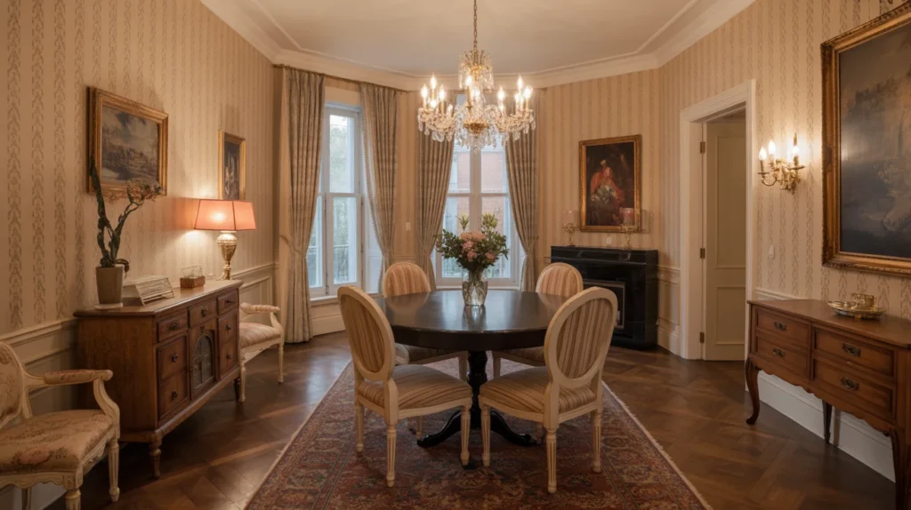 Vintage wallpaper brings timeless elegance to any dining room, offering a sense of nostalgia and classic charm. Old-style patterns, such as damask, toile, or intricate florals, add a refined touch that never goes out of style. These vintage designs create an inviting and sophisticated atmosphere, perfect for those who appreciate traditional decor with a rich history. The soft, muted tones and detailed patterns exude a sense of warmth, making the dining space feel cozy yet elegant. Vintage wallpaper is ideal for anyone looking to introduce a touch of old-world charm while maintaining a sense of classic beauty.