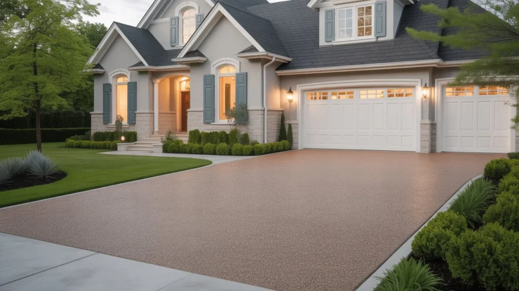 Exposed aggregate is a textured driveway finish that reveals the small stones inside the concrete. It adds visual interest without looking too bold. This option is durable, slip-resistant, and attractive, making it practical for busy homes. The subtle speckled look fits both modern and classic exteriors. It is a great choice if you want decor inspiration that feels refined but low-maintenance. Among stylish ideas, this one stands out for mixing function with surface texture.