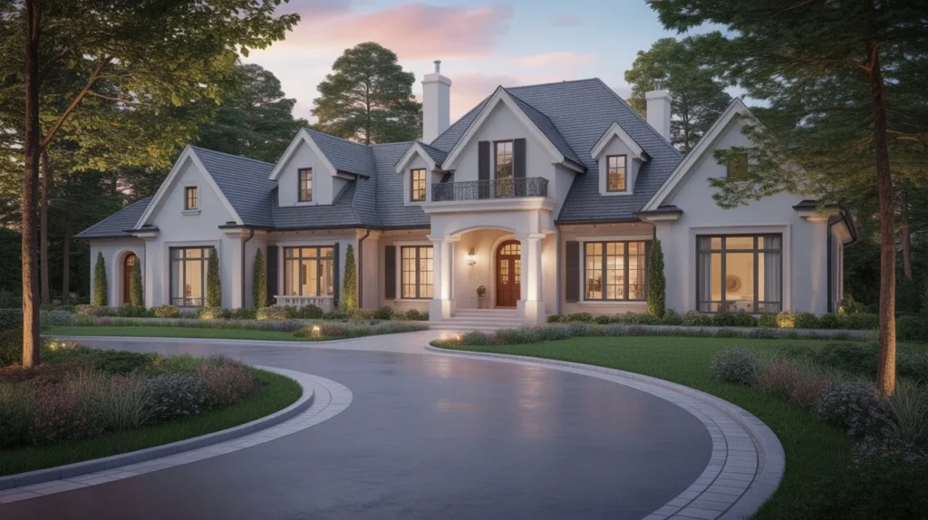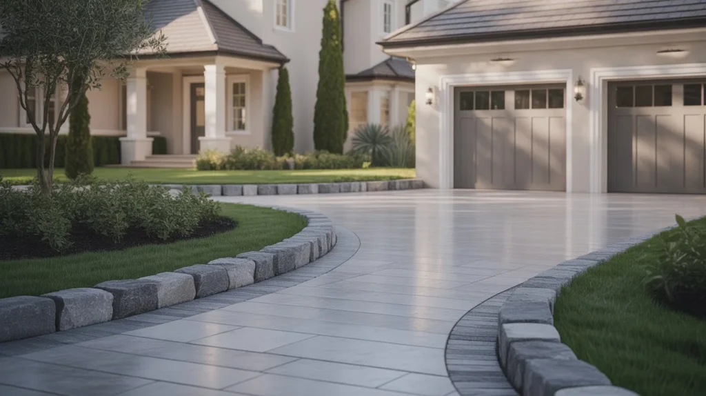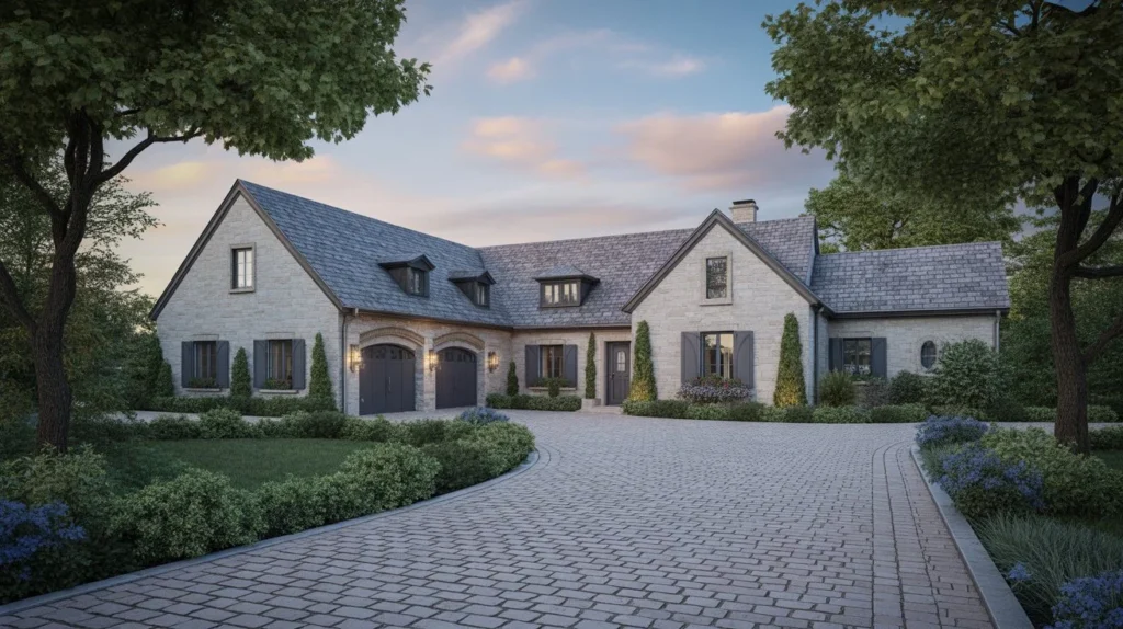 A curved driveway adds movement and softness to a home’s exterior. It feels more natural than a straight driveway and works well with larger yards, mature trees, and landscaped gardens. The curve can make the front of the property feel more spacious and inviting. This style is often used in luxury decor inspiration because it leads the eye beautifully toward the home. It also creates lovely opportunities for layered outdoor room ideas.