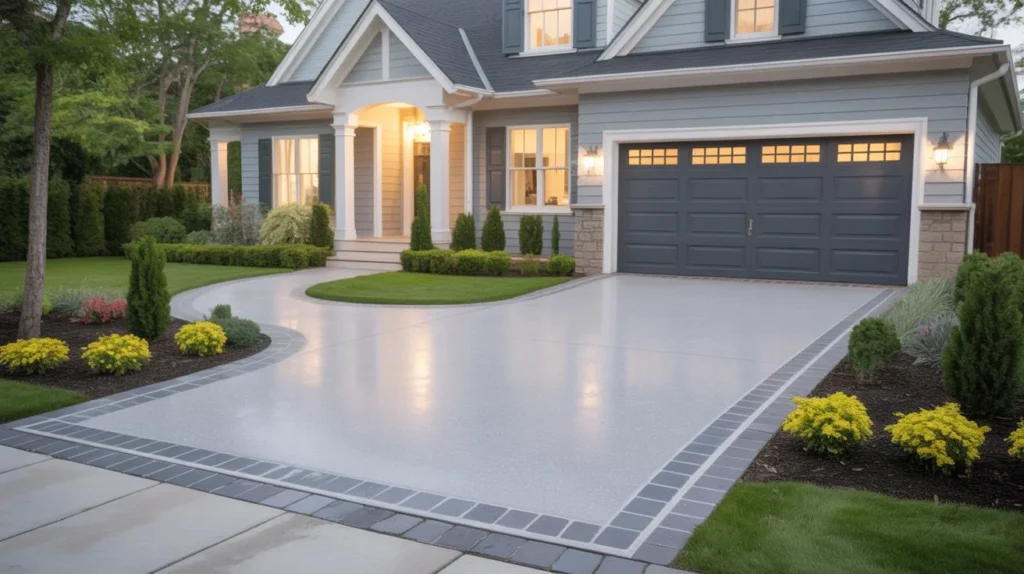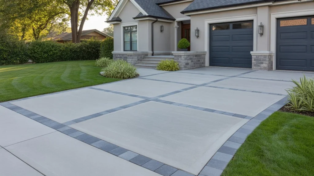 A modern concrete driveway gives your home a clean, polished, and timeless look. It works especially well with contemporary, minimalist, and modern farmhouse homes. Smooth concrete can look sleek on its own, but it becomes even more attractive when paired with sharp edging, green landscaping, or subtle lighting. This design is popular in decor inspiration boards because it feels simple yet premium. It also blends nicely with stylish ideas for outdoor spaces and even front yard room ideas.