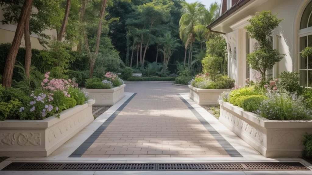Built-in planters can make a driveway feel more custom and full of life. They break up hard surfaces and add color, texture, and softness to the entrance. This idea works especially well for wide driveways, circular layouts, or driveway edges that need more visual balance. It is excellent for decor inspiration because it combines practical structure with natural beauty. These stylish ideas also help tie your driveway into the front yard as a room.