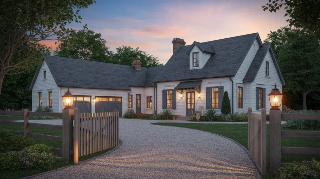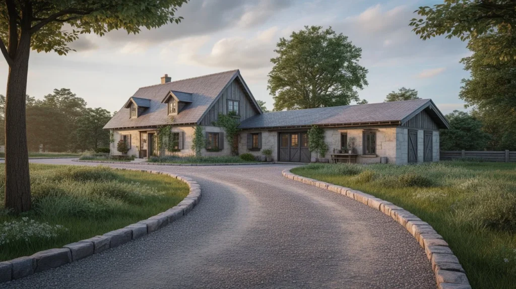 A farmhouse-style driveway feels warm, simple, and welcoming. It usually includes gravel, soft curves, wood fencing, lantern lighting, and natural landscaping. This look works beautifully for country homes or anyone who wants a relaxed and cozy curb appeal. Farmhouse driveways are popular on Pinterest because they mix rustic texture with stylish ideas that feel lived-in and beautiful. They also pair well with front yard decor inspiration and porch-focused room ideas.