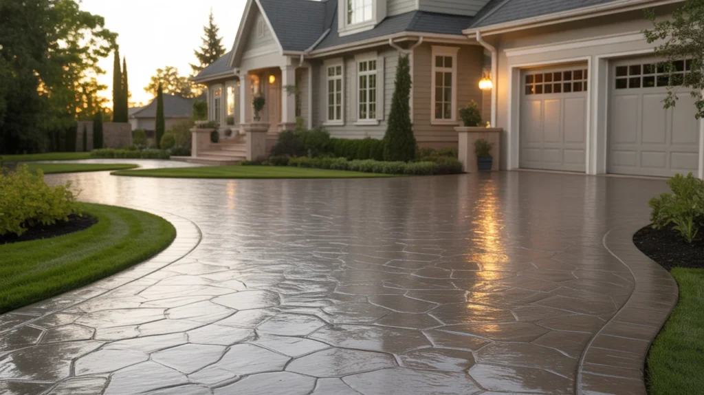 Stamped concrete is a smart way to get the look of stone, brick, or slate without paying the full cost of natural materials. It adds texture and character while staying practical for everyday use. This is a great option if you want your driveway to feel decorative without becoming too busy. It often appears in stylish ideas collections because it creates a designer look at a more affordable price. It also fits homes that need more visual depth in their outdoor room ideas.