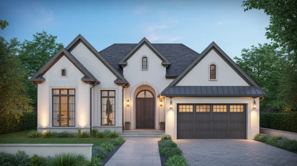 Arched garage door details add softness to exteriors defined by straight lines and hard edges. This design works especially well on Mediterranean, Spanish, French country, and upscale traditional homes. Even if the door itself is rectangular, arched windows or curved panel shapes can create the same graceful effect. These garage door design ideas feel refined and romantic, making them ideal decor inspiration for homeowners who want a more elevated, custom-built look. It is a subtle change, but it can make the whole front facade feel more luxurious.