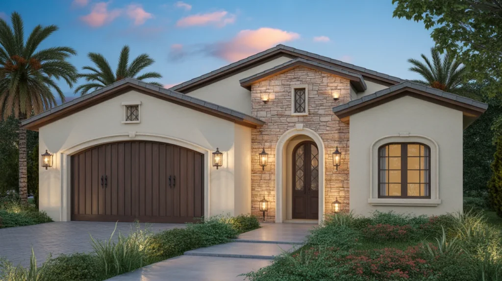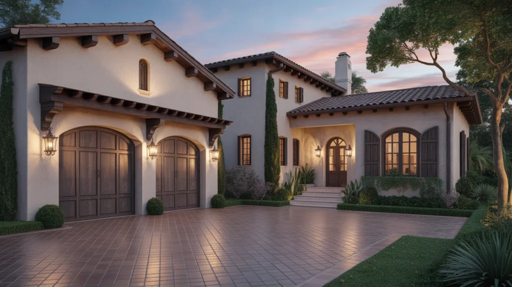 Mediterranean garage doors often feature warm wood tones, iron accents, deep stains, and handcrafted textures that feel rich and old-world. They pair beautifully with stucco walls, clay roof tiles, arches, and stone paths. This style is perfect for homes that need warmth and character at the front elevation. If you love decor inspiration with earthy colors and timeless style, this is one of the most beautiful garage door design ideas to save. It creates a luxurious but inviting exterior with a strong visual story.