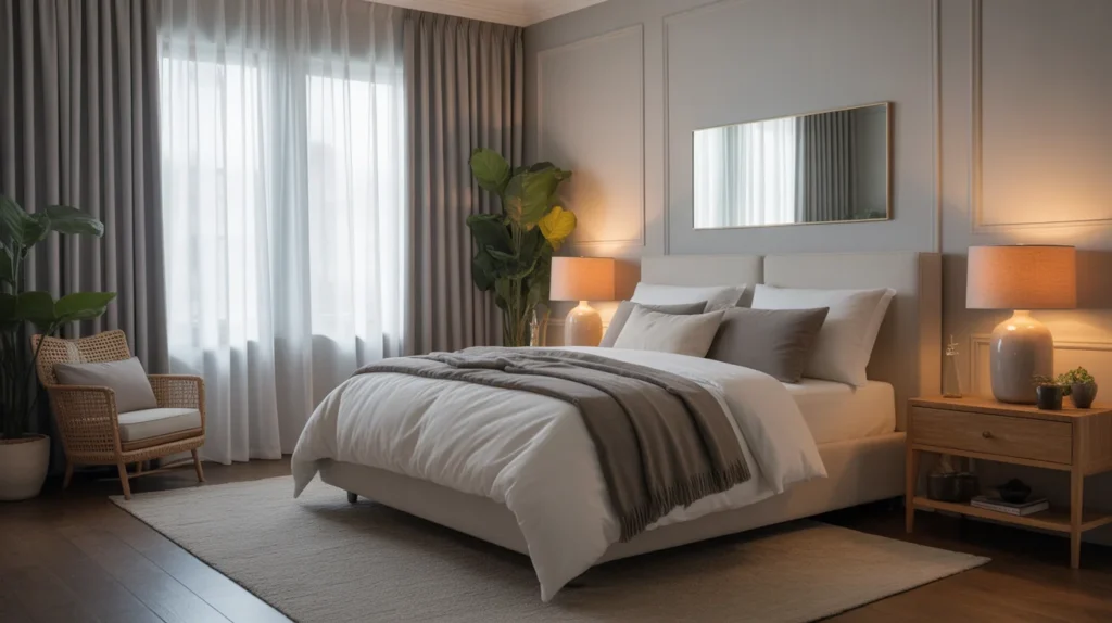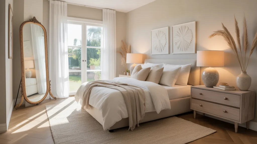 A mirror makes a guest room feel larger, brighter, and more useful. It reflects light and helps guests get ready comfortably. A full-length mirror is ideal, but even a medium wall mirror can make a big difference. This is one of the most practical, stylish ideas because it improves both function and appearance. Mirrors also support a light, airy, trending aesthetic that works beautifully in Pinterest-worthy spaces.