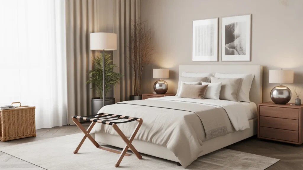 A luggage rack or open bench shows guests you have thought about their needs. It prevents bags from ending up on the bed or floor and makes unpacking easier. Even in a smaller room, a simple folding rack can add a lot of convenience. This practical detail is often overlooked in guest bedroom ideas, but it matters. Functional pieces can still fit a stylish ideas approach when chosen in wood, black metal, or woven finishes.
