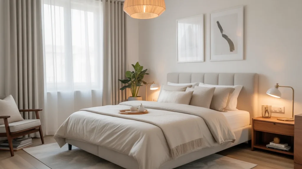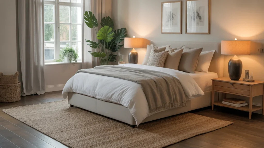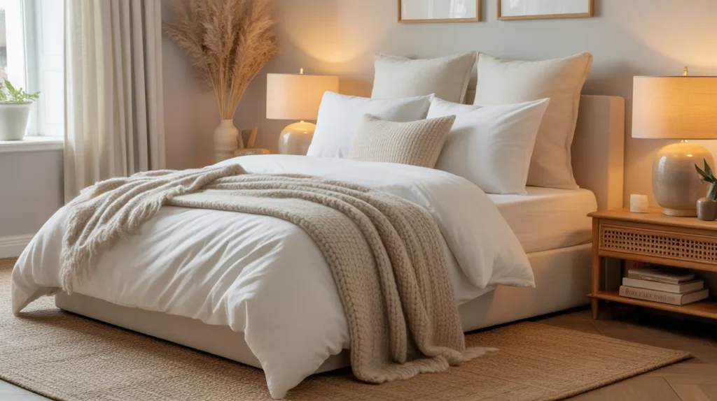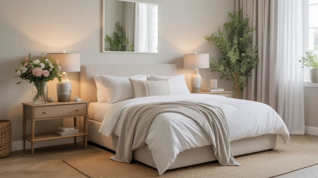 - Use white or soft beige bedding for a fresh, airy look.