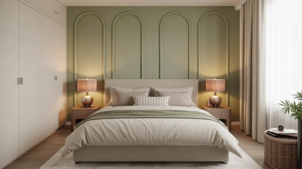 A soft accent wall can add depth without overwhelming the room. Consider muted sage green, dusty blue, warm taupe, or subtle wallpaper. This helps define the bed area and creates a focal point while keeping the room restful. If you want a little more character in your guest bedroom ideas, this is a beautiful middle ground. It adds visual interest and delivers a trending aesthetic without making the room feel too bold for guests.