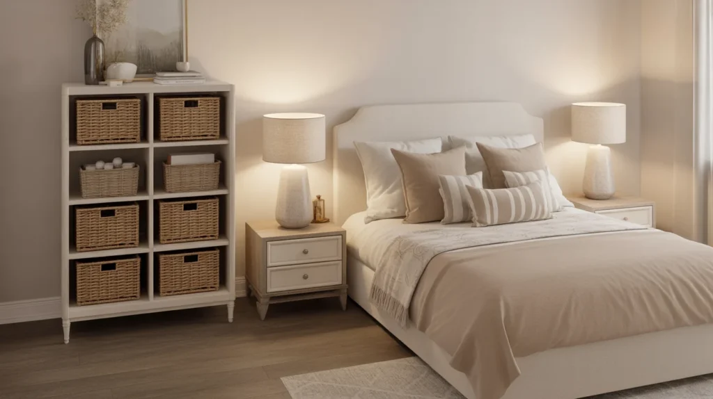 Guests feel more at home when they have a place to unpack. A small dresser, storage cabinet, or woven basket system provides them with space for clothes, accessories, and essentials. It also helps the room stay neat during longer stays. Storage-based room ideas are perfect for keeping the space attractive while improving comfort. This kind of thoughtful decor inspiration balances beauty and function, a combination that is always popular on Pinterest.