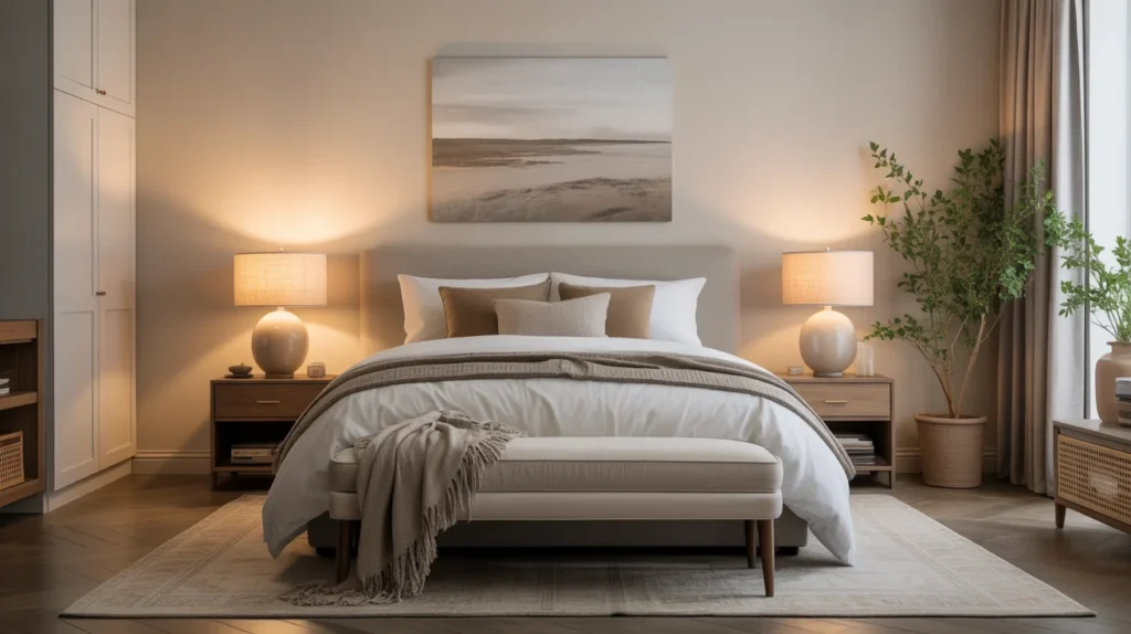 A bench at the end of the bed adds both style and function. It gives guests a place to set a bag, lay out clothes, or sit while getting ready. Upholstered benches add softness, while wood benches create a more natural and minimal look. Among practical room ideas, this one feels especially polished. It also helps the room look complete in a Pinterest-friendly way, adding a layer of decor inspiration without much effort.