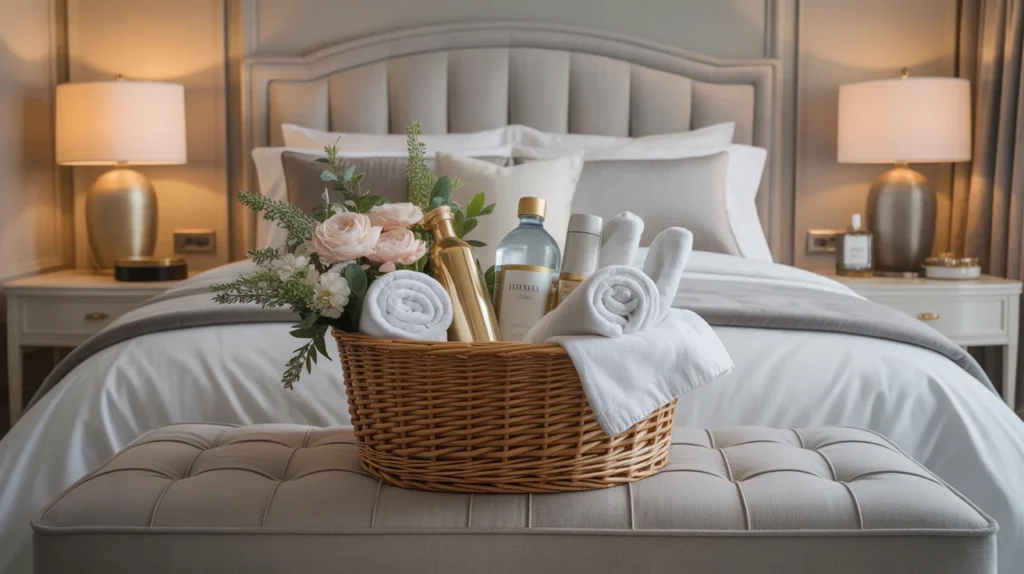 A welcome basket is a thoughtful extra that guests remember. It can include water bottles, snacks, travel-size toiletries, a phone charger, tissues, and a small note. This tiny detail makes the room feel more like a boutique stay. Among guest bedroom ideas, this one is especially useful because it combines hospitality with design. A neat tray or woven basket also adds a charming decor inspiration element to the room.