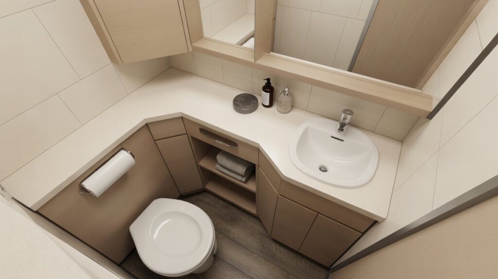 For very small half bathrooms, a space-efficient corner sink is an ideal solution. This smart layout maximizes the available space without compromising on style or functionality. With minimalist décor and a neutral color palette, the compact corner sink creates a clean, streamlined look. The design optimizes every inch of the room, making it feel larger while maintaining a modern, stylish interior. Perfect for tiny spaces, this solution combines practicality with elegance in your powder room.