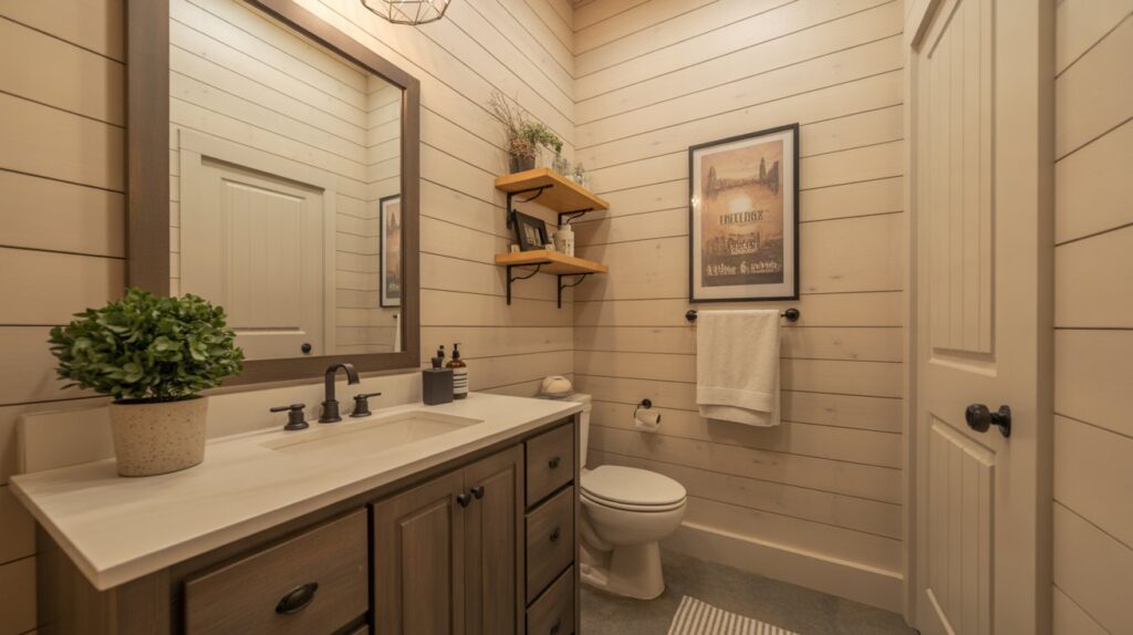 A farmhouse-inspired half bathroom combines cozy charm with rustic appeal. Shiplap walls, paired with a rustic vanity and black fixtures, create a warm, inviting atmosphere that feels both homey and stylish. The neutral tones bring balance, allowing the natural textures to shine. This design evokes a sense of comfort and simplicity, making the small space feel welcoming while maintaining a timeless, charming interior. Perfect for those seeking a cozy, farmhouse aesthetic in their powder room.