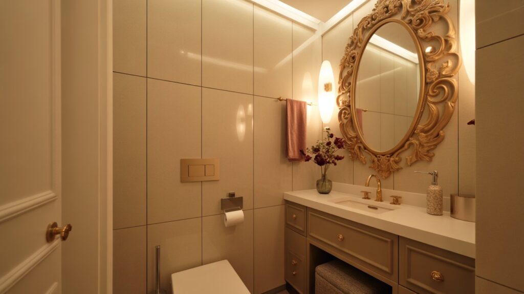 An oversized or uniquely shaped mirror can work wonders in a small half bathroom, transforming it into a visually striking space. A large statement mirror not only serves as a functional focal point but also reflects light, making the room appear larger and brighter. Paired with a sleek vanity, modern lighting, and elegant decor accents, the mirror elevates the overall design, adding sophistication and style to your compact bathroom.