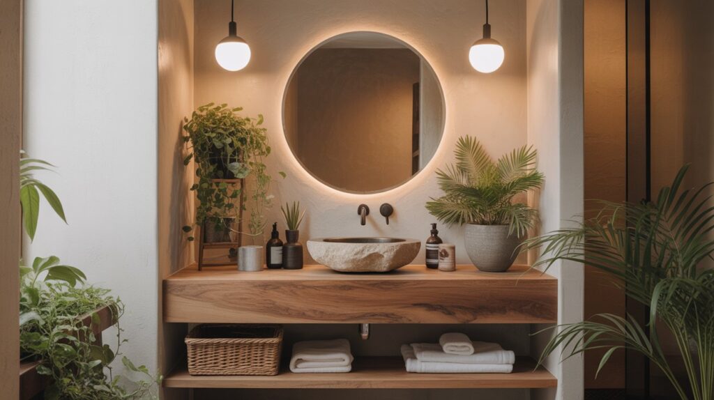 Incorporating natural materials like wood, stone, and plants into your half bathroom adds warmth and texture, creating a calming, organic aesthetic. A wood vanity paired with a stone sink brings earthy elegance, while indoor plants introduce a refreshing touch of nature. Warm neutral tones tie the elements together, creating a serene atmosphere that feels grounded and inviting. This design choice is perfect for those looking to add a touch of nature to a small space while maintaining a stylish, modern look.