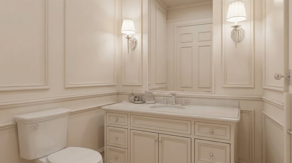 Add depth and character to your half bathroom with textured wall panels or wainscoting. This classic design element enhances the space by introducing rich textures and decorative trim details, creating a timeless aesthetic. Paired with an elegant vanity and soft lighting, wainscoting adds sophistication and charm while maintaining a clean, polished look. This design choice brings warmth and style to any powder room, making it feel more refined and inviting.